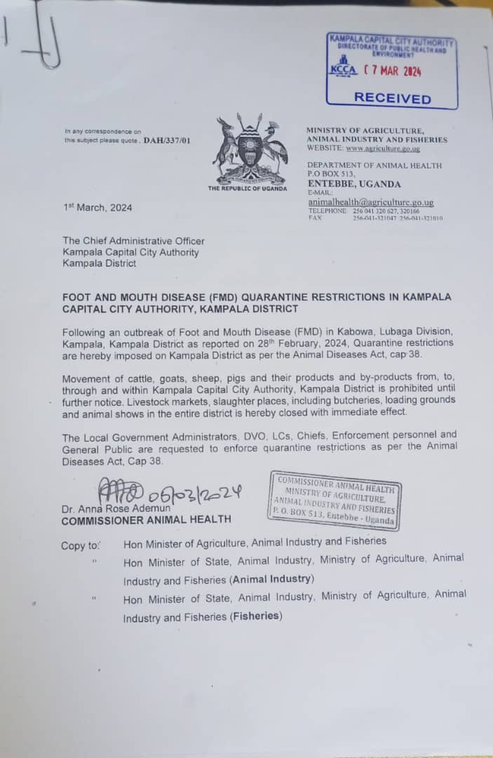 “Following an outbreak of foot and mouth disease in Kabowa – Lubaga Division Kampala, as reported on 28th Feb 2024, quarantine restrictions are hereby imposed” the letter reads in part.