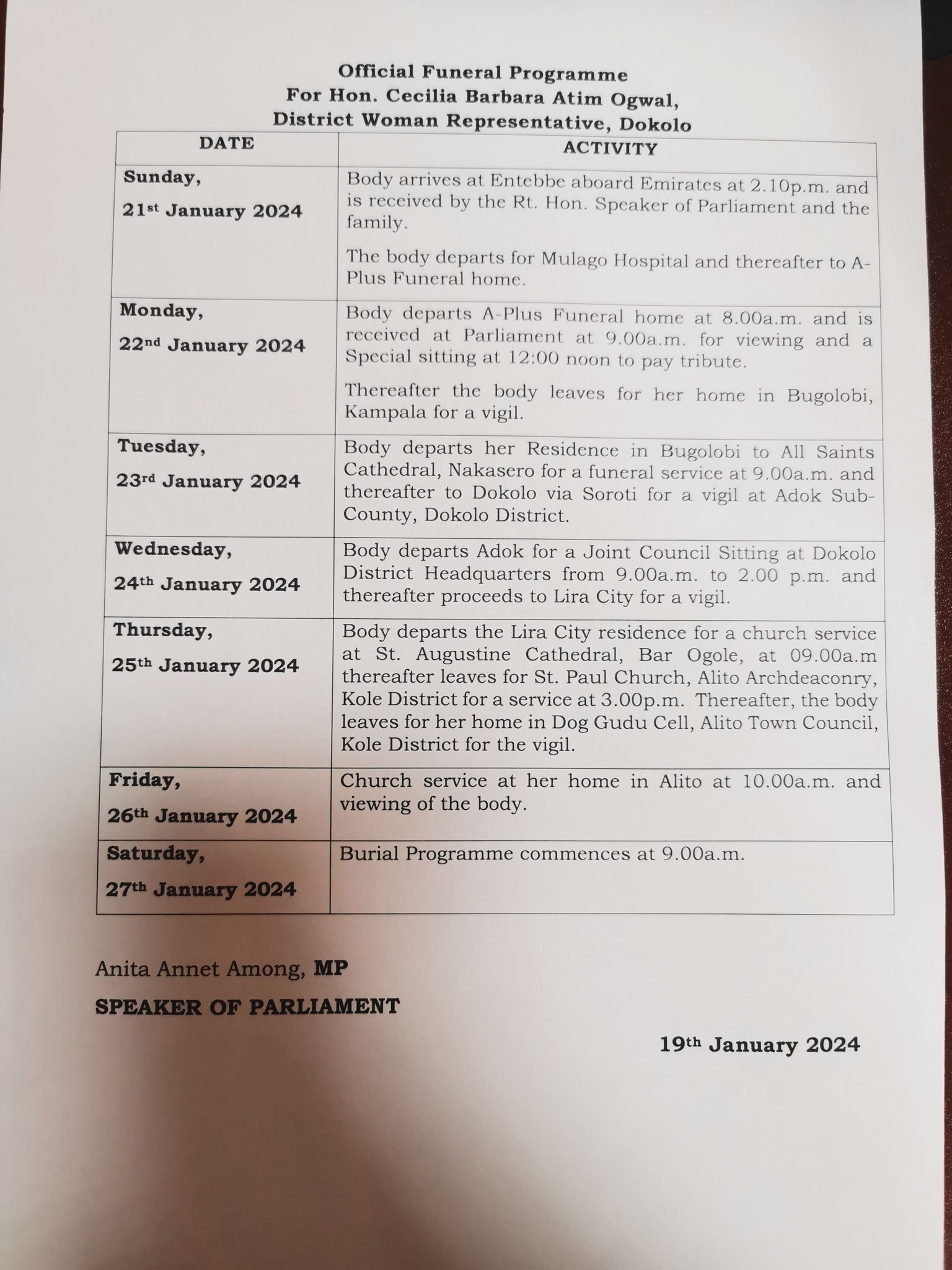 On Monday 22nd Jan 2024 s/her body will lie in state at Parliament at 2:00PM from where she will be taken to Bugolobi in Kampala at her home for a vigil.